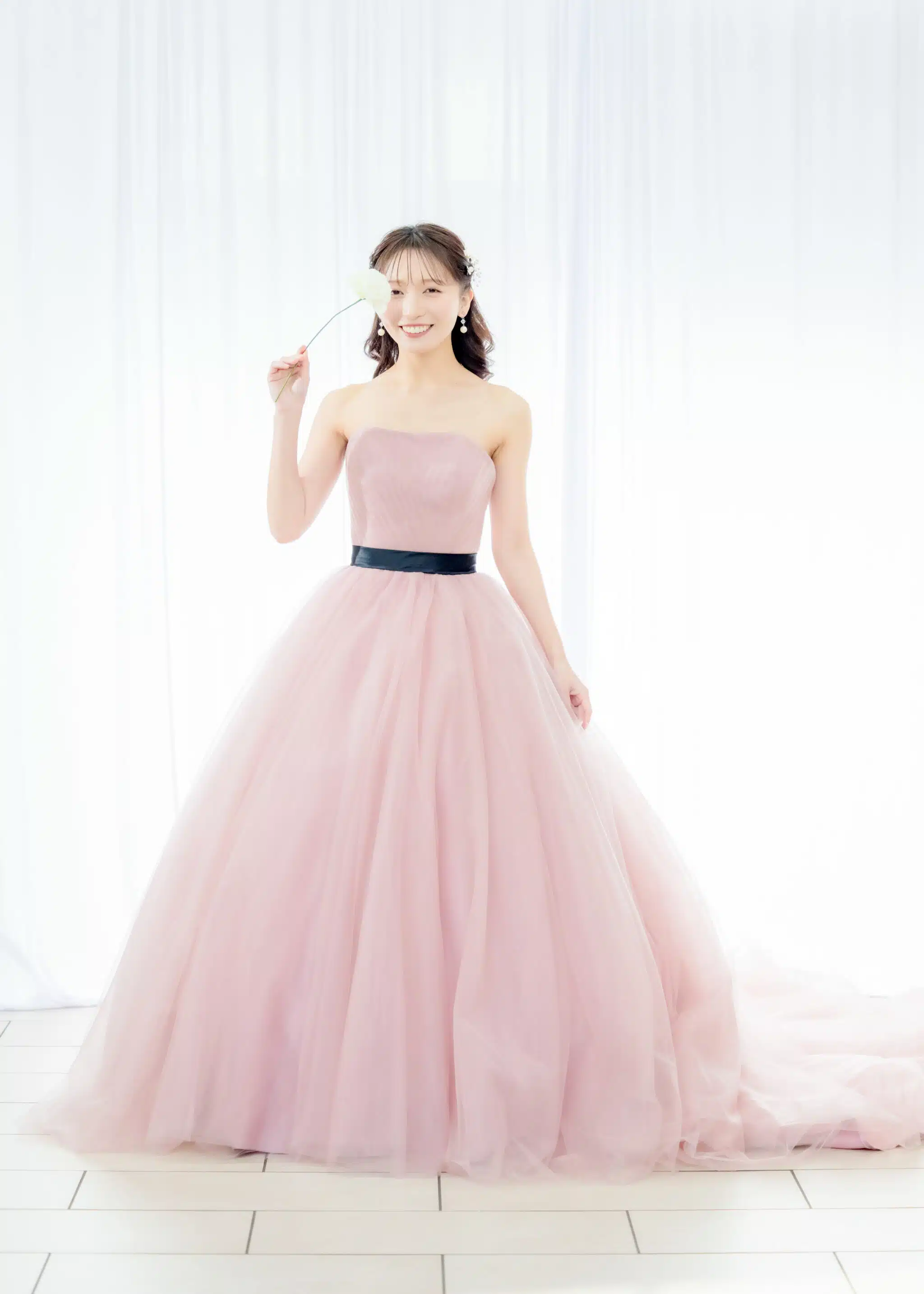 やわらかなピンクカラーが肌になじむ、チュールの重なりが美しいボリュームドレスです。